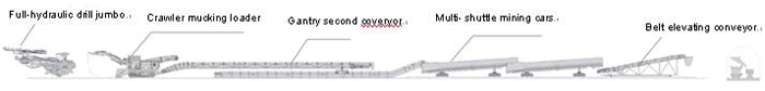 El cargador hidráulico de excavación mas avanzado en China se utiliza, cual puede cargar ganga rápidamente, y no en ángulo ciego. El carro minero se conecta con la cinta transportadora elevada para descargar varios carros mineros simultáneamente. Antes de que los carros mineros regresen, el carro minero con mayor capacidad de almacén puede guardar ganga temporariamente para balancear el trabajo y para que el material perforado por mes y nivel de mecanización sea aumentado.